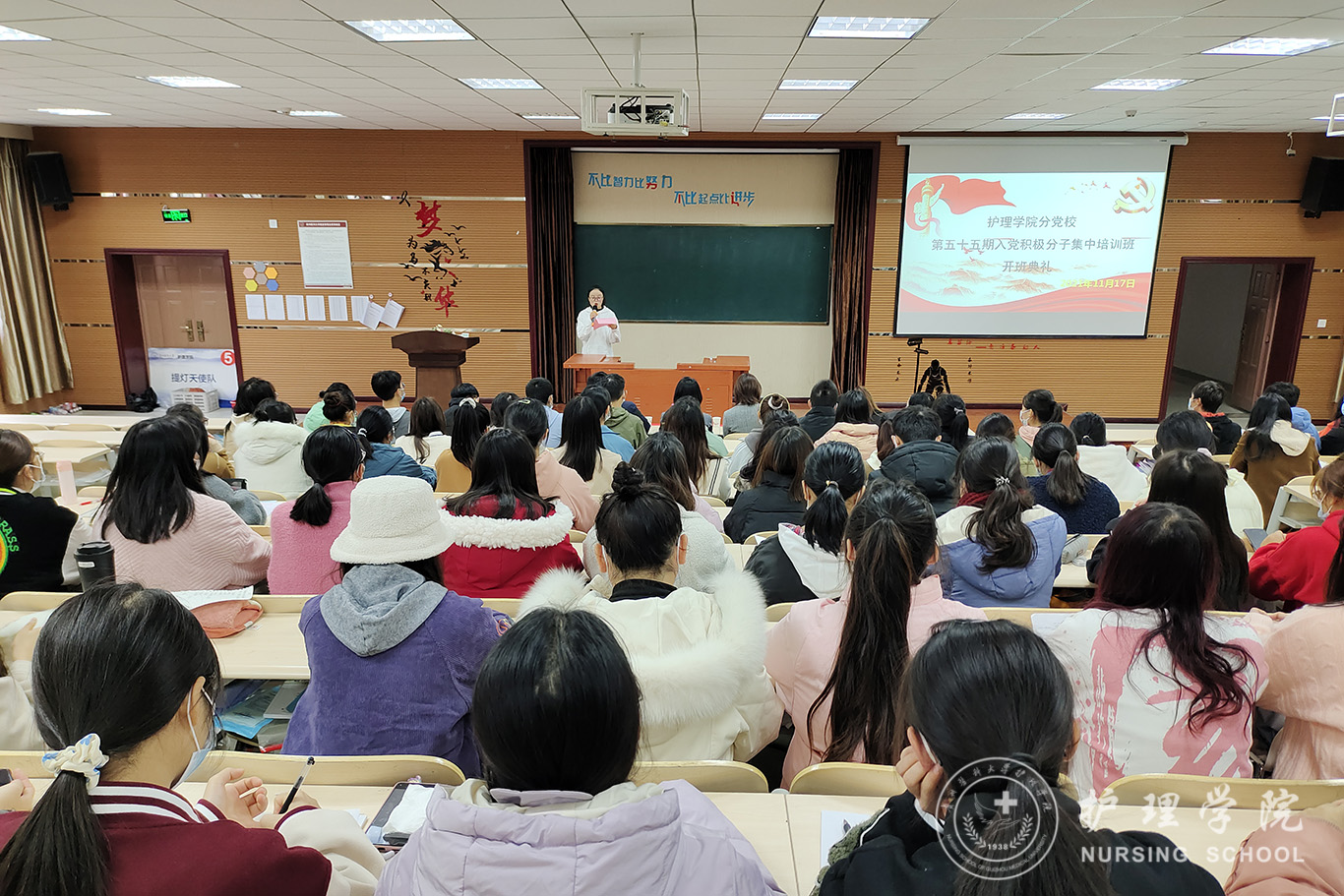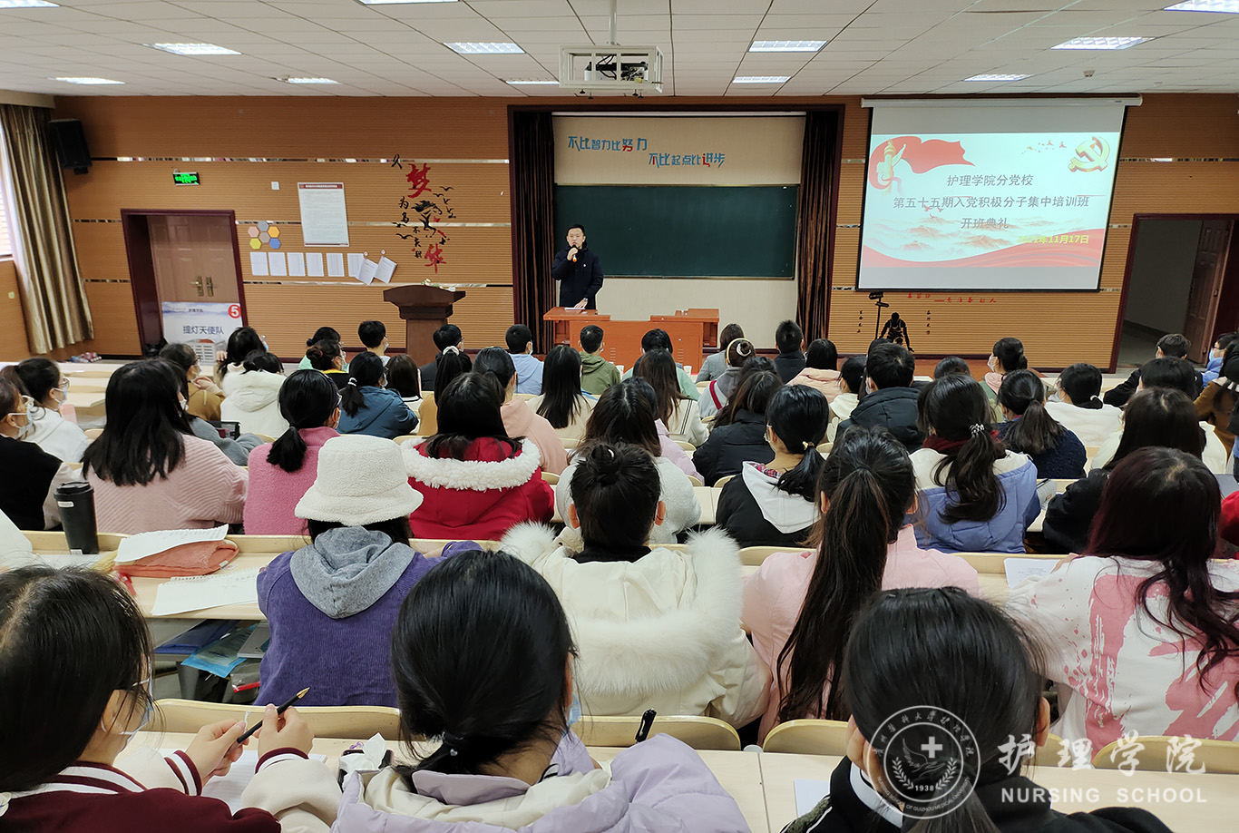 开班典礼在庄严的国歌声中拉开序幕。首先2020级助产学唐梦蝶代表全体入党积极分子承诺,将以积极、认真、严肃的态度对待此次学习,深刻学习党的基础理论知识,在思想上与党组织靠拢,争取早日加入中国共产党。接着,杨英对全体学员提出四点要求,一是要坚定信念,志存高远;二是要认真学习,提高修养;三是要端正入党动机,树立良好价值观;四是要严于律己,知行合一。让自己不单单成为一名合格的老员工,也能成为一名合格的共产党员。