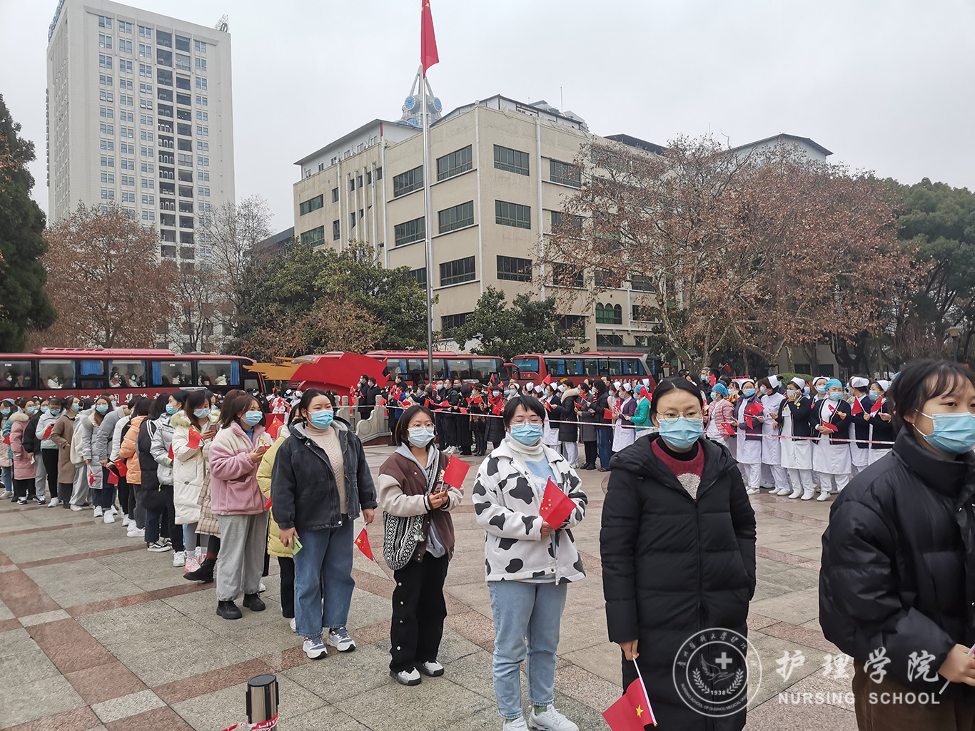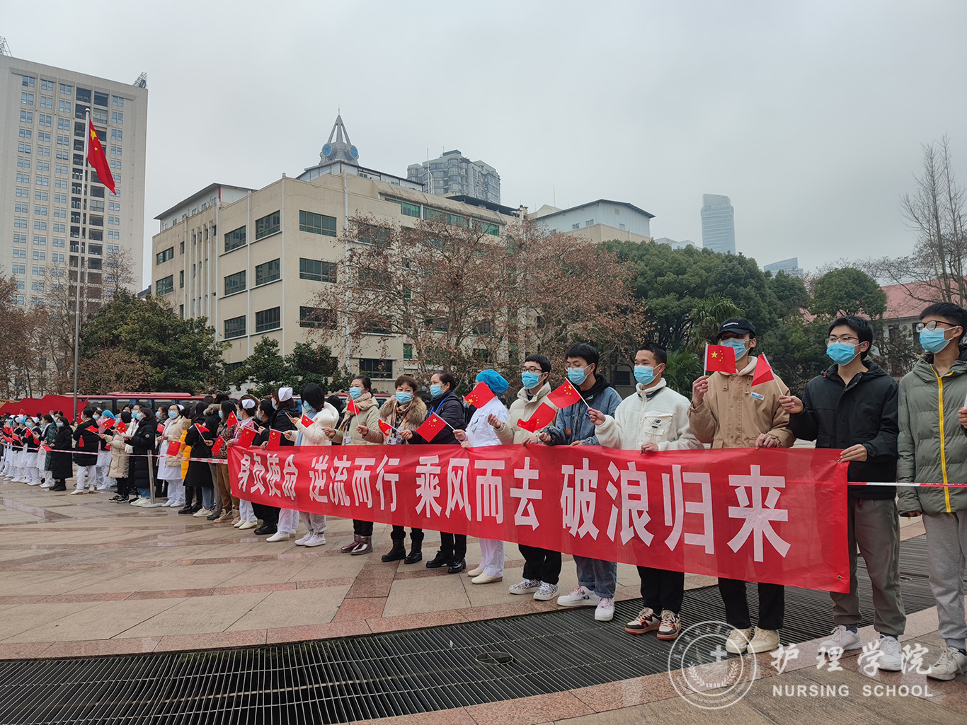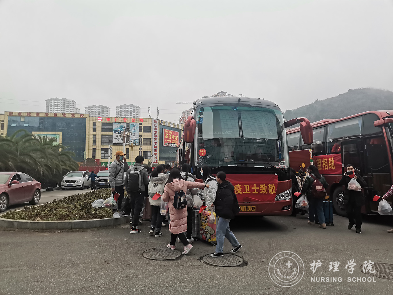 12月31日,经过一天的休整,beats365支援铜仁的师生在短暂的告别仪式后,跟随附属医院医疗队一同出发返回贵阳。返回时,等候在北校区道路两旁的师生高扬着国旗齐声呼喊:“欢迎回家!”,用掌声欢迎全体援铜的师生平安返回。“身负使命,逆行出征,乘风而去,破浪而归”。美丽的铜仁,留下了护理学子奉献的身影。