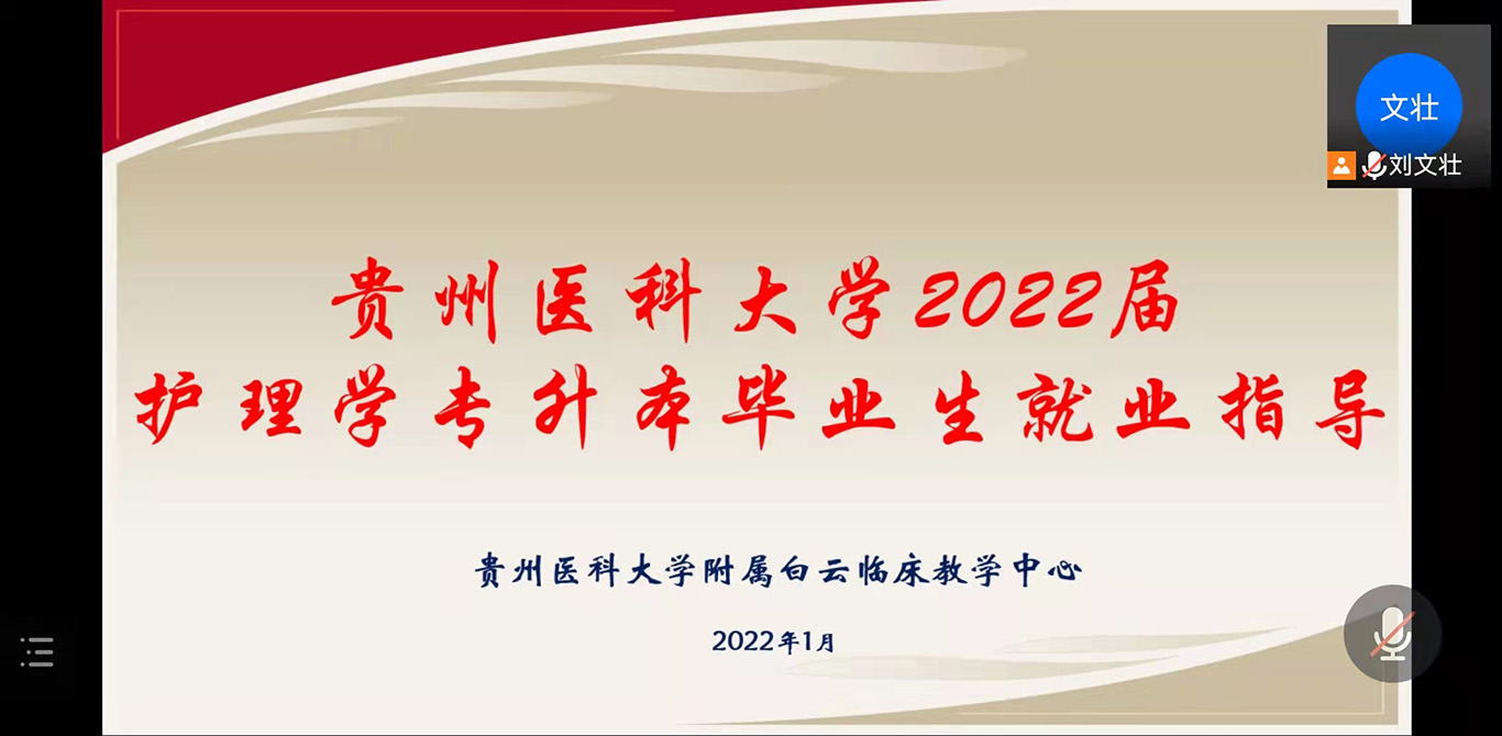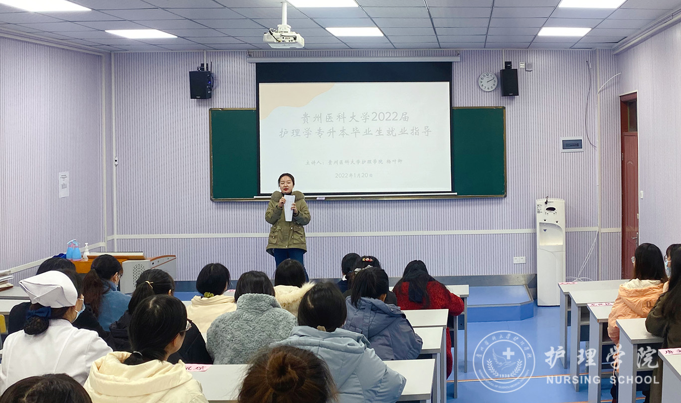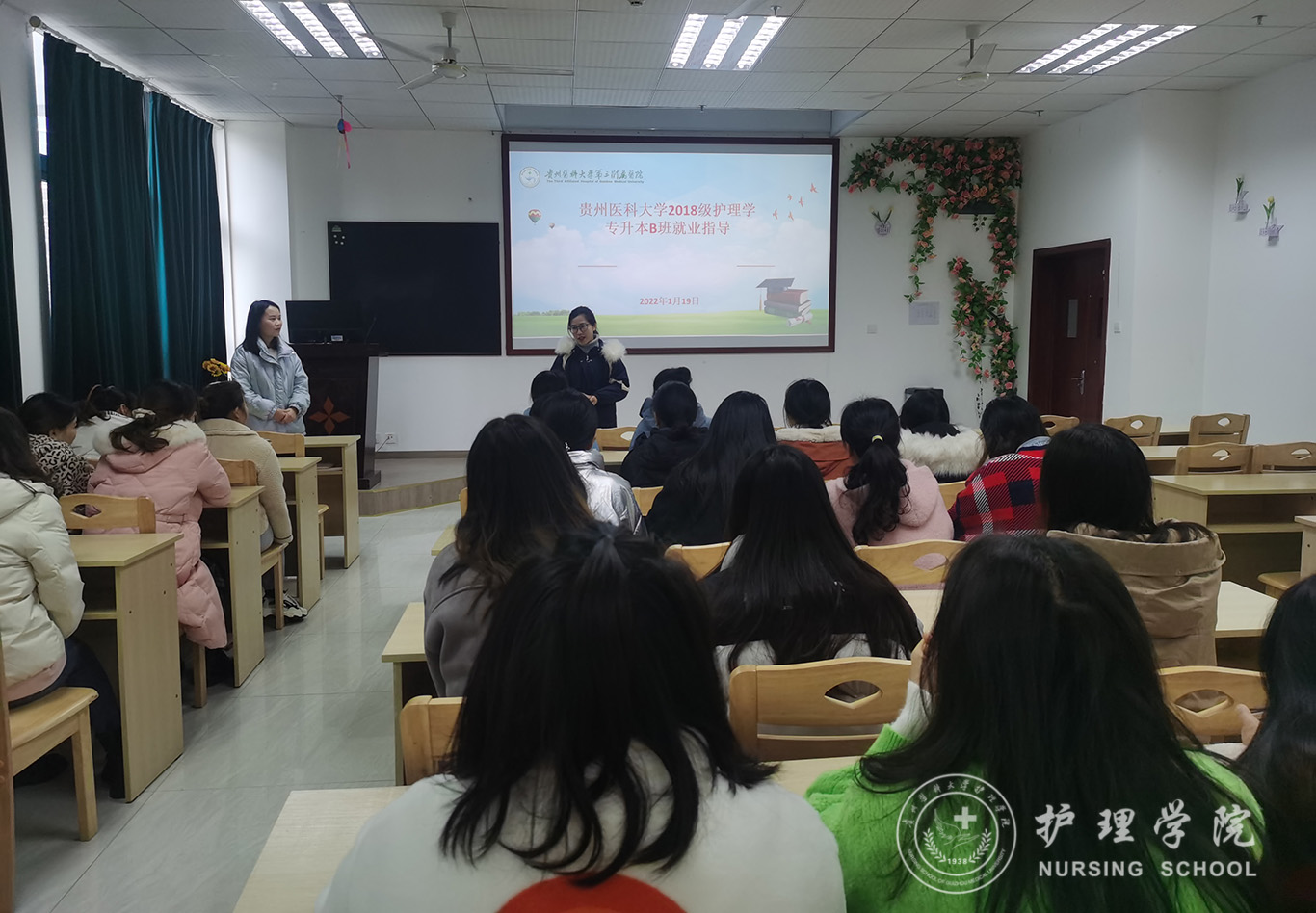为进一步加强和做好毕业生就业指导工作,教育和引导毕业生正确认识当前的就业形势,树立正确的择业观、就业观,努力提高专升本毕业生的就业能力和就业质量。1月18日-21日,公司员工管理科副科长毕丽以及指导各教学点毕业生就业的校本部辅导员杨叶卿、刘妍、兰光倩、刘文壮分别在beats365官网亚洲网页版二附院教学点、三附院教学点、铜仁市人民医院教学点以及附属白云医院教学点为2022届护理学专升本毕业生开展就业指导主题班会。