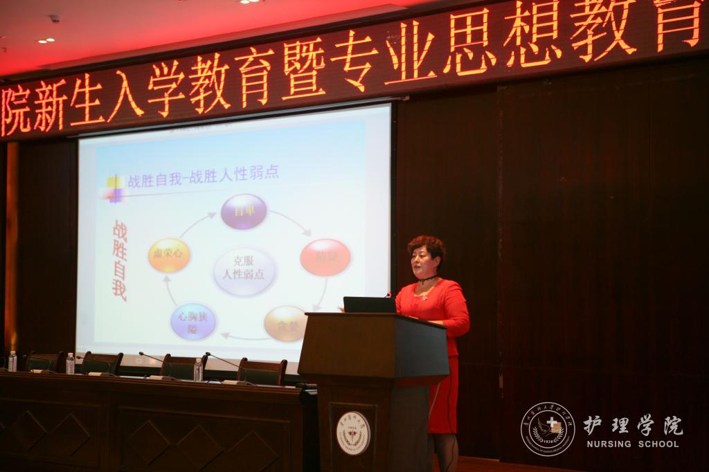 教师代表徐锟则从专业思想引领的角度分享了自己的护理学学习经历。徐锟老师结合自身实际、联系当今社会发展的现实,以老年人护理和孕妇护理为例分析了护理学的现实发展状况和长远发展前景,使新生有了更高的职业期待。