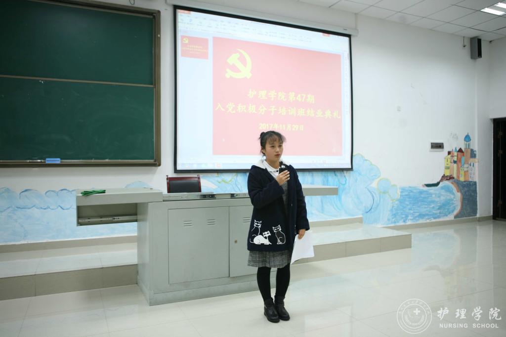大会开始,全体起立,奏唱《国际歌》。接着,公司党委副书记杨英代表公司党委向顺利结业的全体学员表示热烈祝贺,向为本期培训班辛勤付出的老师们表示衷心的感谢!杨英指出,公司党委高度重视本期培训班的各项工作,经过老师和同学们的共同努力,圆满地完成了预定的培训任务。这次培训班课程安排合理,内容丰富,办得非常成功,有以下几点是值得肯定的:一是培训内容丰富,主题突出。二是培训方式多样,亮点突出。三是培训时间集中,效果突出。同时,杨英就同学们如何在实践中巩固和扩大培训成果,不断成长进步,提了几点希望:一是希望同学们继续加强理论学习,提升政治理论素养。二是希望同学们进一步明确人生目标,坚定理想信念。三是希望同学们进一步端正入党动机,主动接受党组织的教育和考验。四是希望同学们坚持学以致用,以实际行动争取早日入党。紧接着,2016级护理学乙班的程娅同学代表优秀学员进行交流发言,分享了自己的学习收获,并代表本期入党积极分子对自己的思想、学习等方面提出了新的目标和更高的要求。最后,公司员工党支部副书记马景瑶宣读了公司对14名优秀学员的表彰决定,公司党委副书记杨英为优秀学员颁发了荣誉证书,并合影留念。
