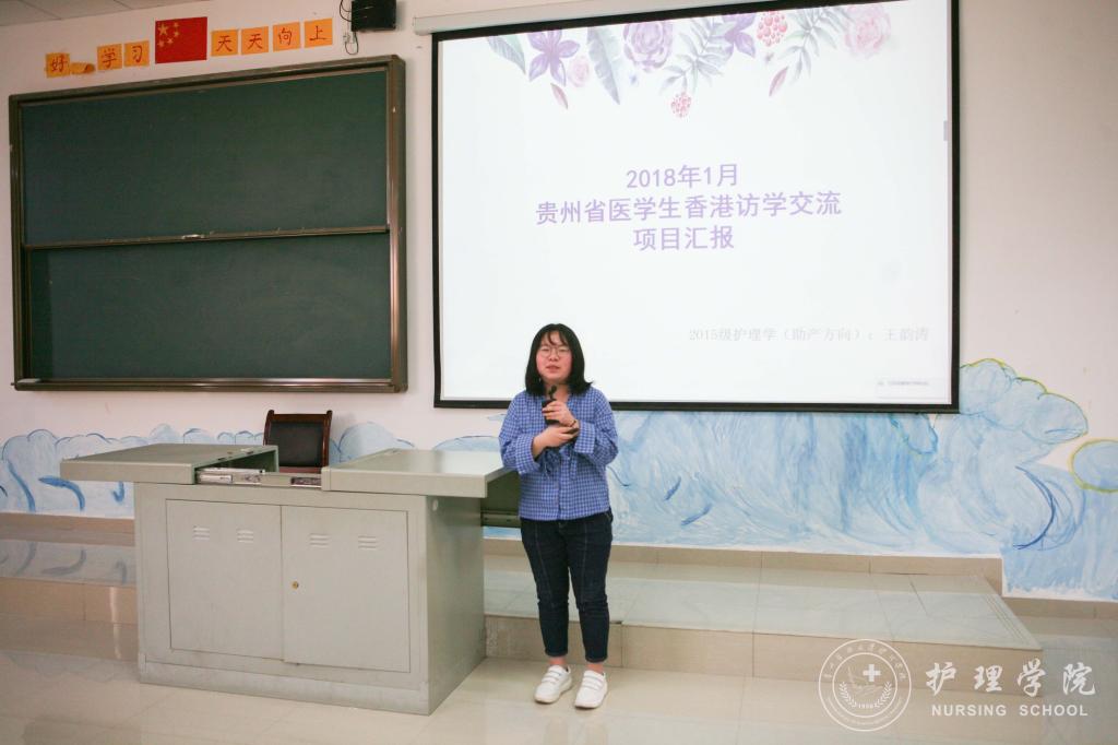 会上,参与2018年1月贵州省医员工香港访学交流项目的2015级护理助产方向王韵涛同学,从香港医疗体制、香港港安医院交流、香港浸信会医院学习、文化生活体验等四个方面,用精心准备的汇报材料详细介绍了到香港访学的基本情况、自己的学习生活及访学体会,重点讲解了香港医疗体制、护理学士教育和香港医疗发展现状。鼓励参会同学抓住机遇,多去不同的环境,体验不同的文化,开阔眼界,不断成长。