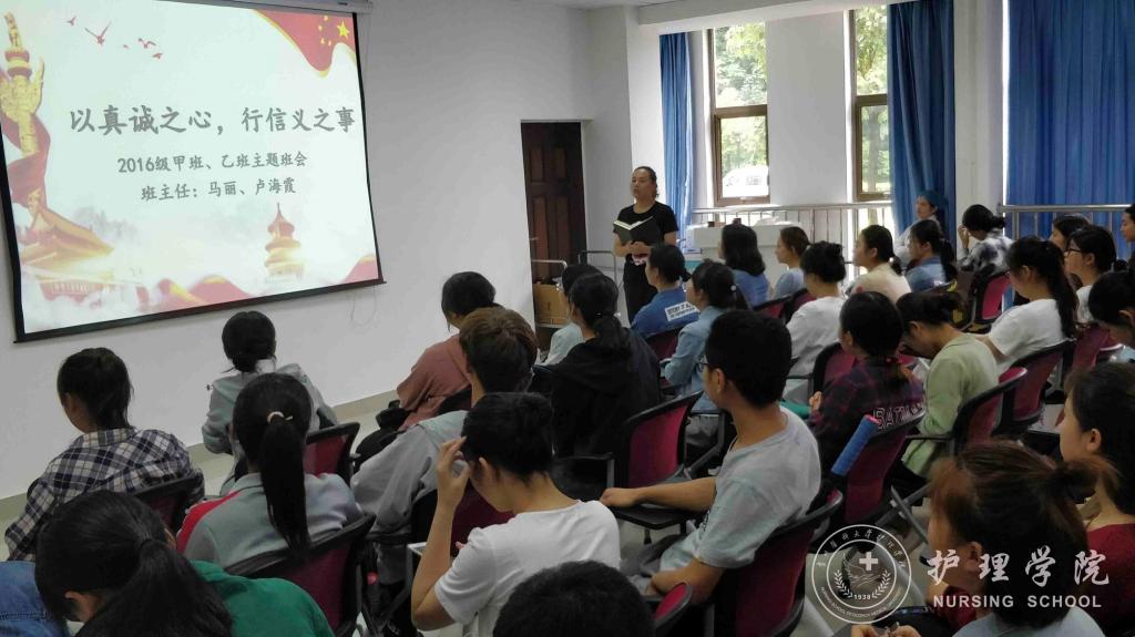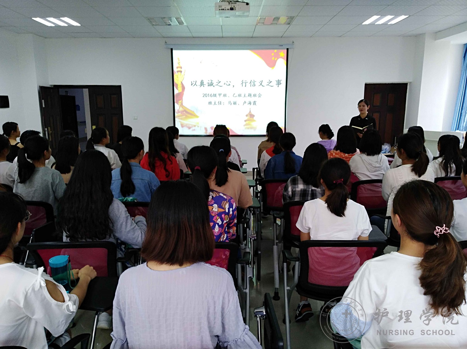 2018年6月20日上午,beats3652016级护理甲班﹑乙班于南校区百川楼教室召开了以“以真诚之心,行信义之事”为主题的班会。班会由甲班班主任马丽﹑乙班班主任卢海霞主讲。
