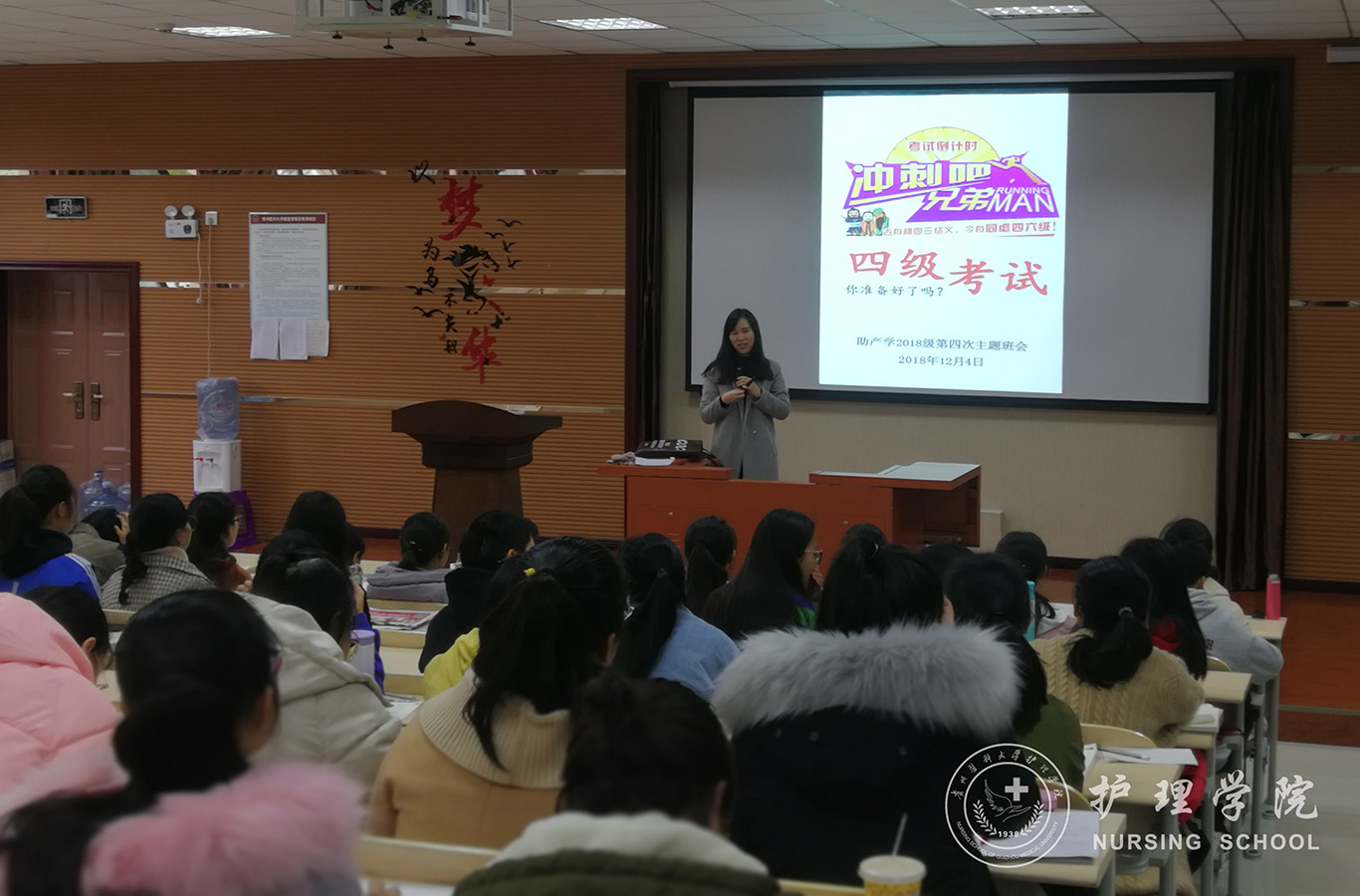 为迎接即将到来的CET-4考试,12月4日上午,beats365助产学2018级助产班在百川楼阶梯教室召开“CET-4备考冲刺”主题班会,此次班会由班主任戴黎黎主讲,助产学2018级全体同学参会。