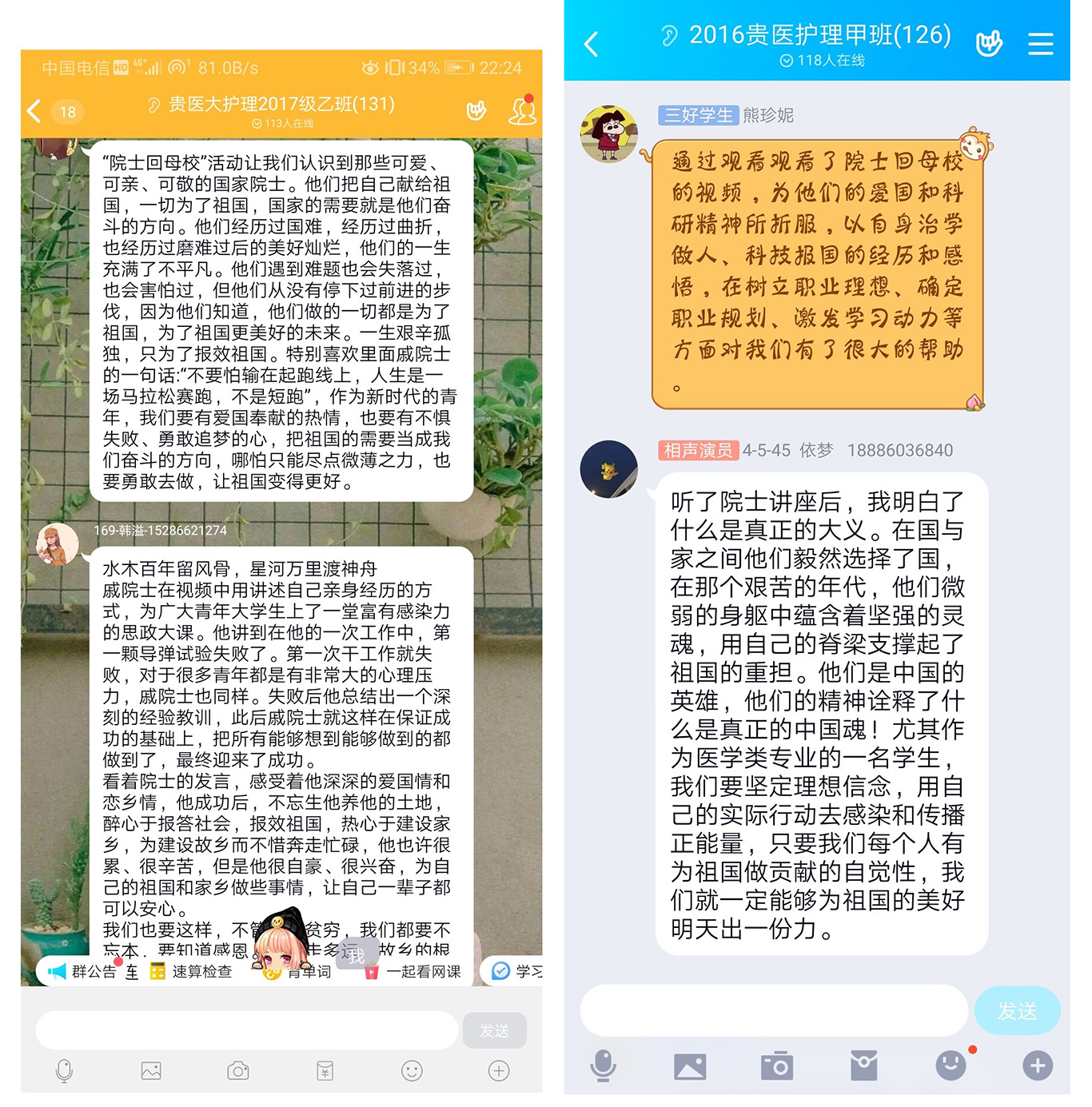 在学习之后,各班同学在班级教室、QQ群等进行了讨论交流,结合自身实际分享了心得体会。院士们的先进事迹让同学们感受到了院士们的强大人格魅力,也坚定了同学们实现梦想的决心。院士们的爱国精神、奉献精神、担当精神、敬业精神、追梦精神也深深地激励着同学们为学习报国而努力。同学们纷纷表示:在未来的道路上,定会以院士为榜样,爱国敬业,追逐梦想,不断奋斗,成为一个对国家、对社会、对人民都有用的人。