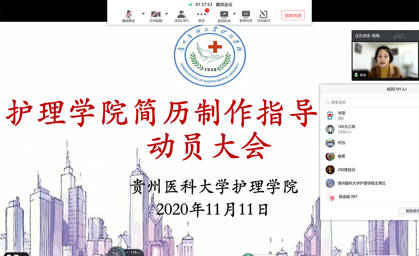 最后,杨英结合当前护理学本科员工近年的就业情况,对参会同学提出了三点要求:一是要认清就业形势,坚定就业信心。二是要树立正确就业观念,做到清晰定位。三是要明确就业目标,放平就业心态,树立先就业再择业的就业观。