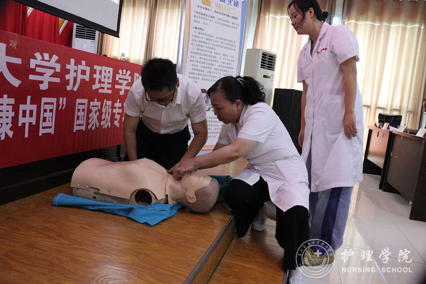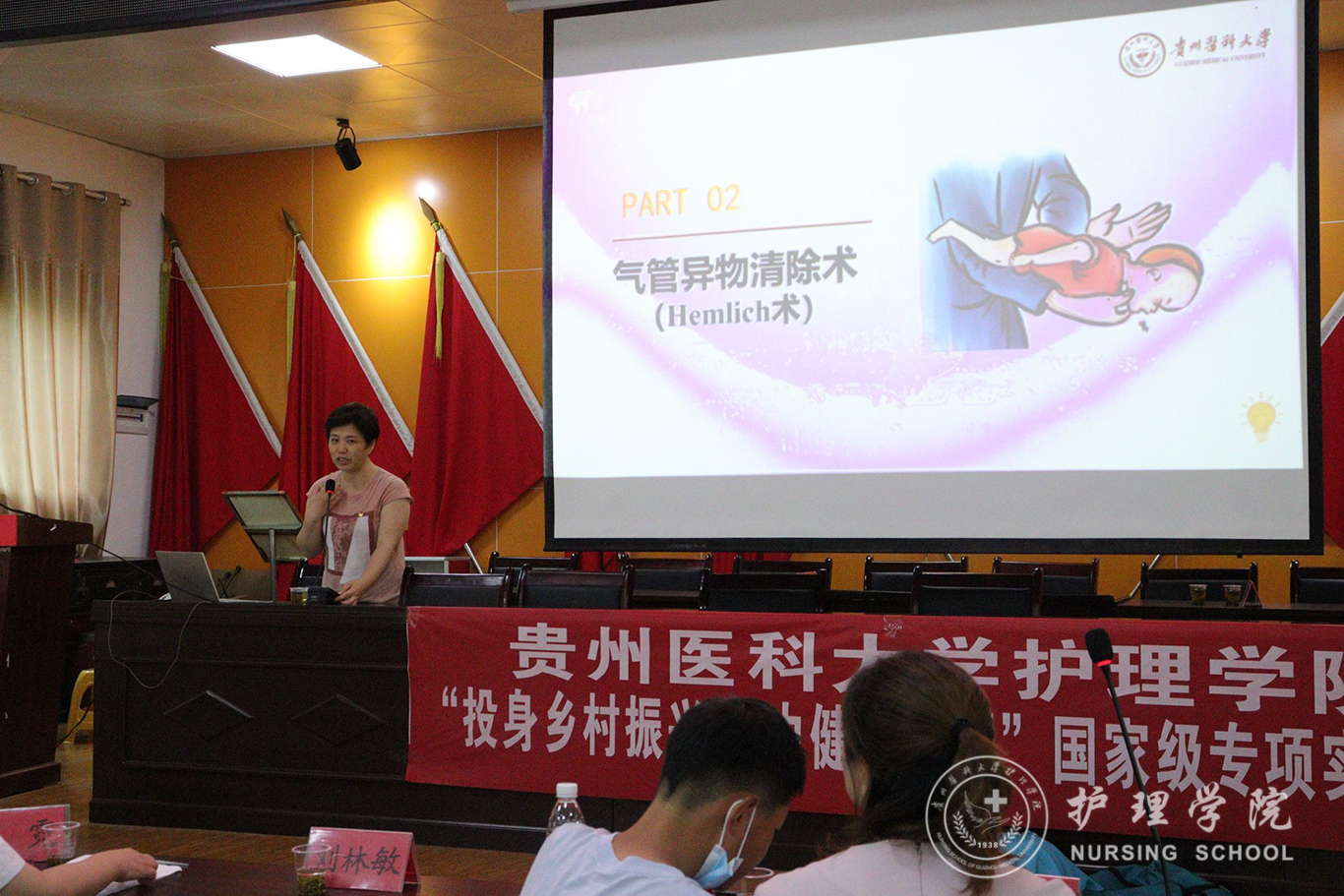 仪式结束后,beats365教师党员代表张仁莉、晏家芳、刘林敏、肖霓及beats3652022年暑期三下乡社会实践服务队的同学向蕉溪镇人民政府全体职工及各村负责健康建设工作的干部开展了健康知识讲座,对海姆立克急救法、心肺复苏术等急救技术进行了宣讲。