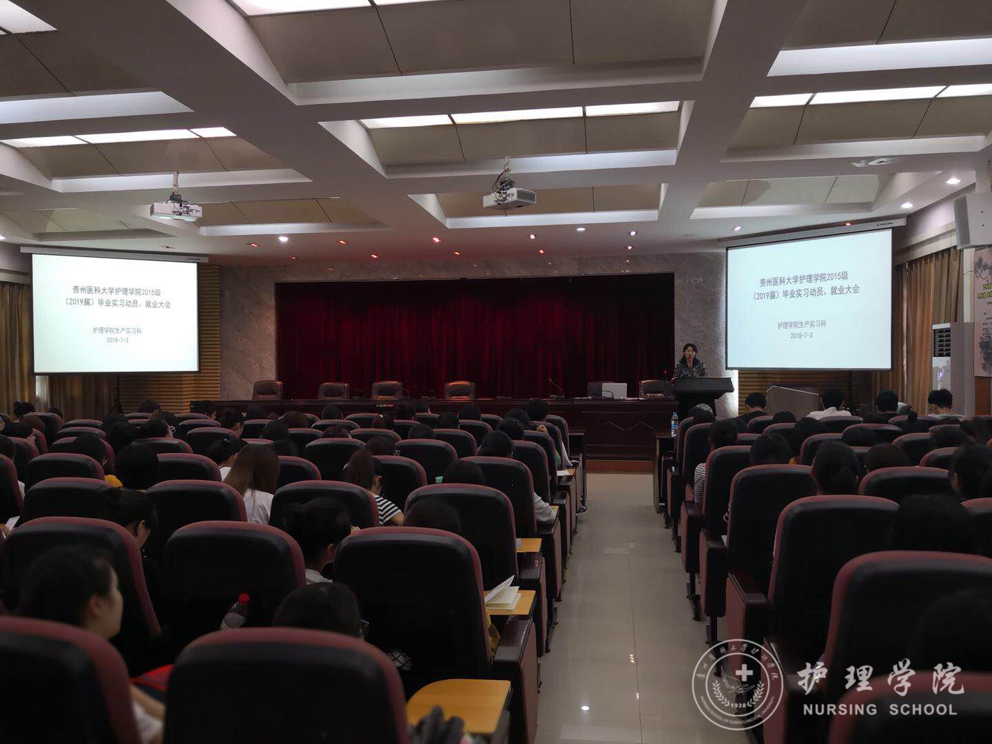 为帮助同学们调整心态,做好实习前准备,7月3日14:00,beats365在北校区道德讲堂召开了“2015级毕业实习、就业动员大会”。公司党委副书记杨英、副经理刘志燕、员工科科长曾敏、生产实习科科长柳忠燕、基护教研室教师王先美、2015级辅导员李颖以及全体2015级同学参加了本次大会。会议由柳忠燕老师主持。