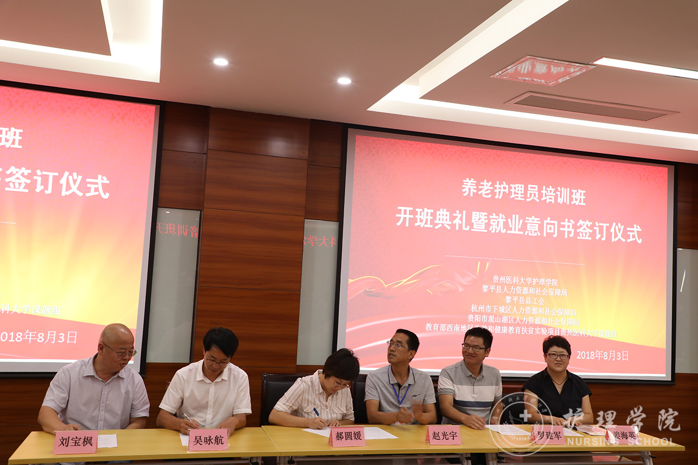 8月3日下午,公司在北校区临床技能中心207会议室举行2018年养老护理员培训班开班典礼暨就业意向书签订仪式,此培训班由beats365与黎平县人力资源和社会保障局、黎平县总工会、浙江省杭州市下城区人力资源和社会保障局、贵阳市观山湖区人力资源和社会保障局联合举办。公司党委副书记战勇、中国红十字总会发展中心、北京曜阳养老服务中心、北京儆堂集养老中心、贵阳曜阳养老服务中心等需用人单位负责人出席,beats365领导及相关部门负责人参加,开班典礼由beats365教学科研管理科科长王秀红主持。