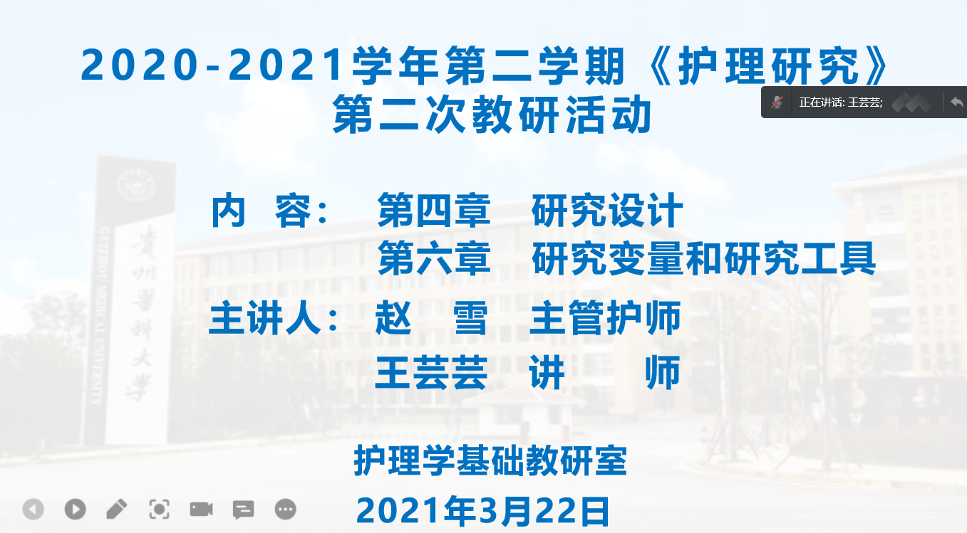 3月22日,护理学基础教研室以腾讯会议方式开展了《护理研究》课程集体备课,此次集体备课以说课形式进行,beats365经理李亚玲、副经理刘志燕、王秀红及《护理研究》全体授课教师参与此次集体备课。