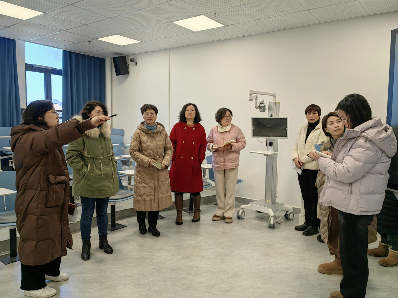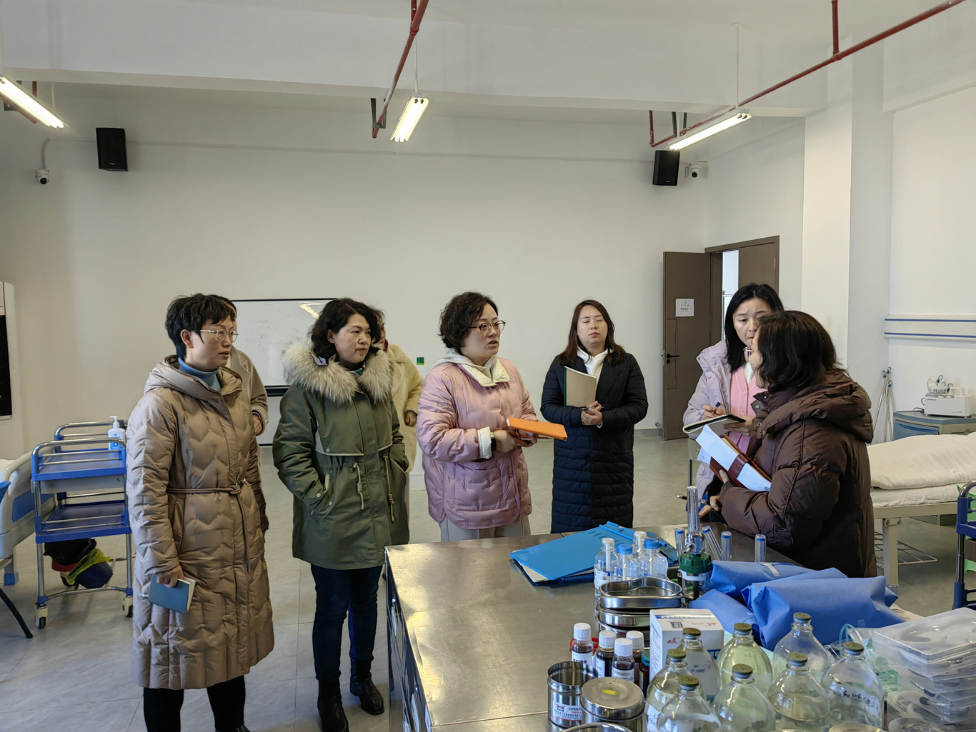 王秀红一行逐一走访了实验室的所有教学场地,对每一处空间进行细致勘察,共同擘画实验室建设的未来规划。在现场,各位老师围绕6S管理、模拟病房区域的科学布局、走廊文化墙的创意构思、VR沉浸式虚拟仿真技术的深度应用等关键领域,展开了深入讨论,并提出了许多可行性强的指导性意见和建议,技能实验室主任熊吴燕表态,将带领实验室全体教师共同参与,积极推动实验室建设工作的完善与升级。