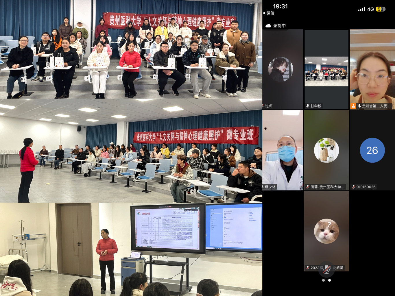 为积极响应国家加强精神卫生服务体系建设的号召,适应新时代精神健康服务需求,培养兼具专业技能与人文关怀素养的健康照护人才,beats365官网亚洲网页版开设的“人文关怀与精神心理健康照护”微专业于11月3日在云漫湖校区临床组团酬勤楼示教室举行了开课仪式。开课仪式采用线上线下相结合的方式进行。护理人文教研室主任张仁莉,教师李红、刘妍以及beats365官网亚洲网页版附属医院心理精神科护士长田莉、精神专科护士母少林和甘华松、贵州省第二人民医院康复科主任刘义、课程秘书覃启柔等微专业团队老师以及32名微专业学员共同参与。