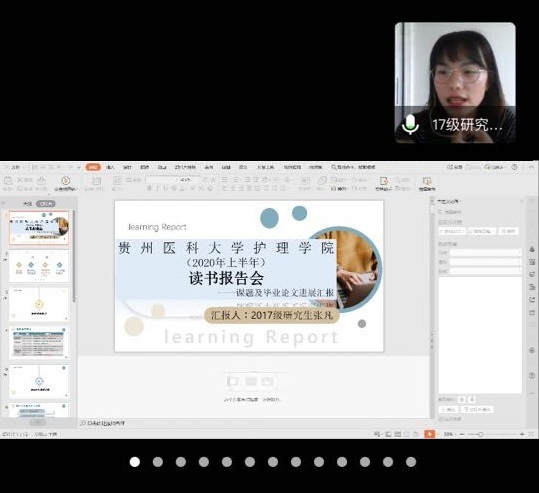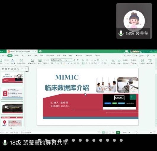 会议由公司党委副书记王秀红主持。本次读书报告会共分两个环节进行,首先由2017级方雯、覃瑛、张凡、李晓杰4位同学汇报了课题进展及学位论文完成情况,同学们结合自身完成课题和学位论文撰写过程中的经验和体会做了分享和交流。随后导师和同学对4位同学的汇报进行了点评。接下来的环节,2018级研究生张丽娟和裴莹莹分别以PPT形式进行了15分钟的读书报告汇报。张丽娟以“冰山理论”为题,分享了冰山理论核心观点及在护理研究领域的应用,裴莹莹以“MIMIC数据库介绍”为题,较为系统介绍了MIMIC数据库的使用。导师们根据员工的综合表现进行线上面对面点评,同时通过问卷星对员工汇报内容就选择意义、内容掌握、延伸拓展等方面进行综合考评,作为公司产品学术综合成绩评定参考。