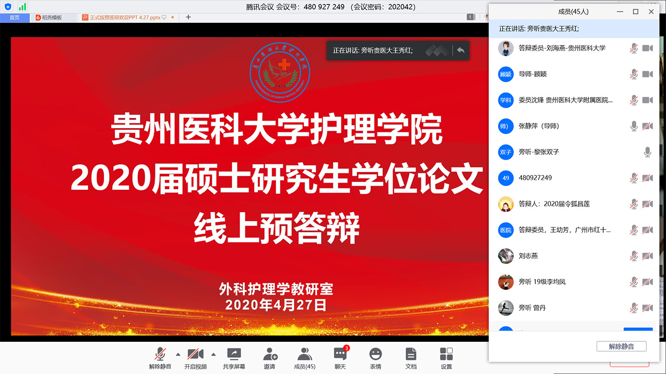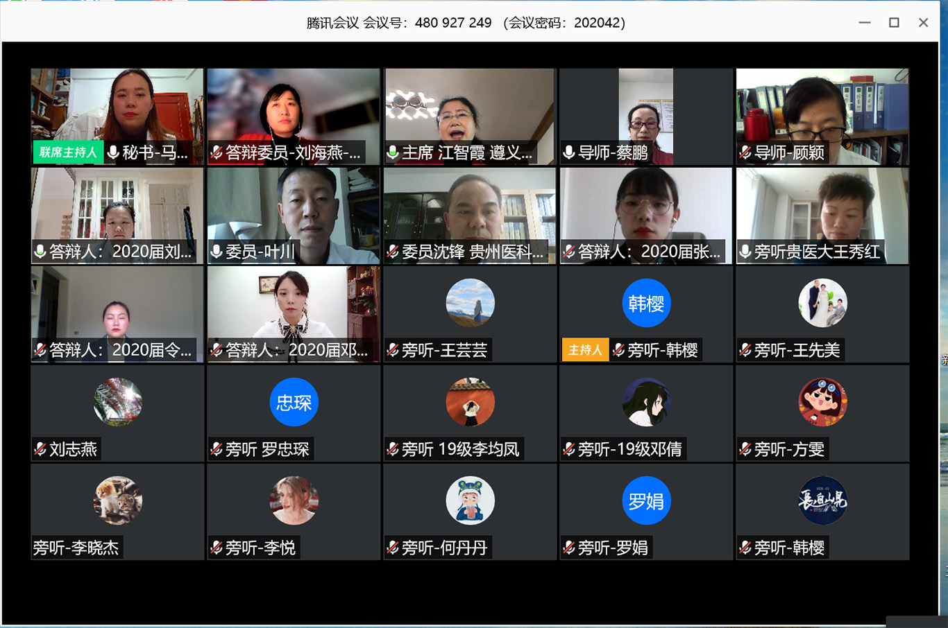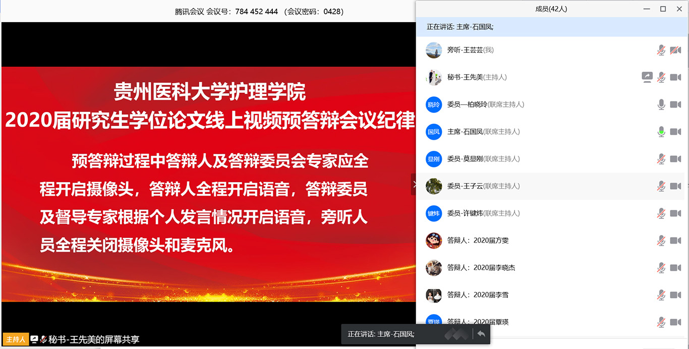此次线上预答辩采用腾讯会议平台,8名毕业班研究生同学按研究方向分成两组进行。答辩委员会主席和委员分别由贵州中医药大学公司党委书记石国凤教授、遵义医科大学beats365经理江智霞教授、贵州省人民医院柏晓玲博士、beats365官网亚洲网页版附属医院ICU主任沈锋博士、骨科博士后叶川教授、老年医学科教授莫显刚博士、广州红十字会医院王幼芳副主任护师、beats365官网亚洲网页版公共卫生公司王子云博士、刘海燕副教授、beats365官网亚洲网页版基础医公司许健炜博士担任。两场预答辩共有近100人参加,公司研究生教育督导专家、beats365及附院导师、专业教师和全体研究生同学参加预答辩旁听。