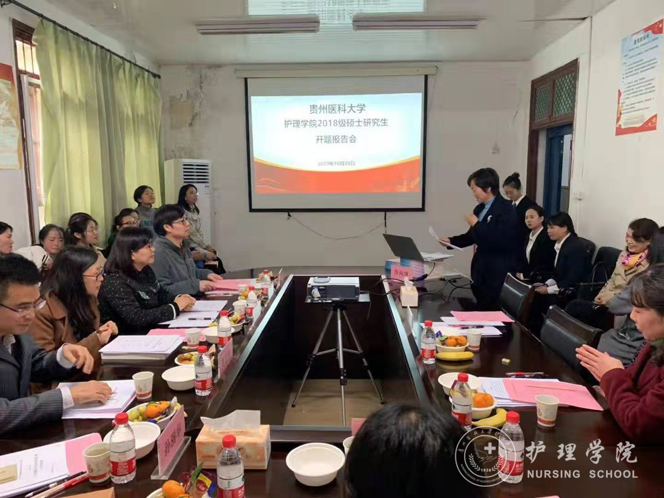 此次开题由beats365官网亚洲网页版附属医院神经外科主任、博士生导师杨华教授任专家组组长,贵州中医药大学beats365石国凤教授、beats365官网亚洲网页版公共卫生公司汪俊华副教授、beats365官网亚洲网页版临床公司老年医学教研室莫显刚博士、附属医院疼痛科孙丽华副主任护师任专家组成员。老年保健与护理、护理临床疾病与基础研究方向王晶、裴莹莹和张丽娟3名同学参加此次开题。同学们分别就自己的课题进行了20分钟汇报,并接受了专家的询问指导。