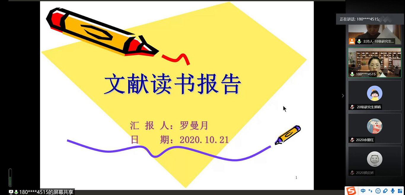 本次读书报告会由2018级研究生裴莹莹主持,读书报告会分为研究生汇报和师生点评两个部分进行。首先由2019级研究生罗曼月、李悦、岳跃学3位同学以PPT的形式进行汇报。