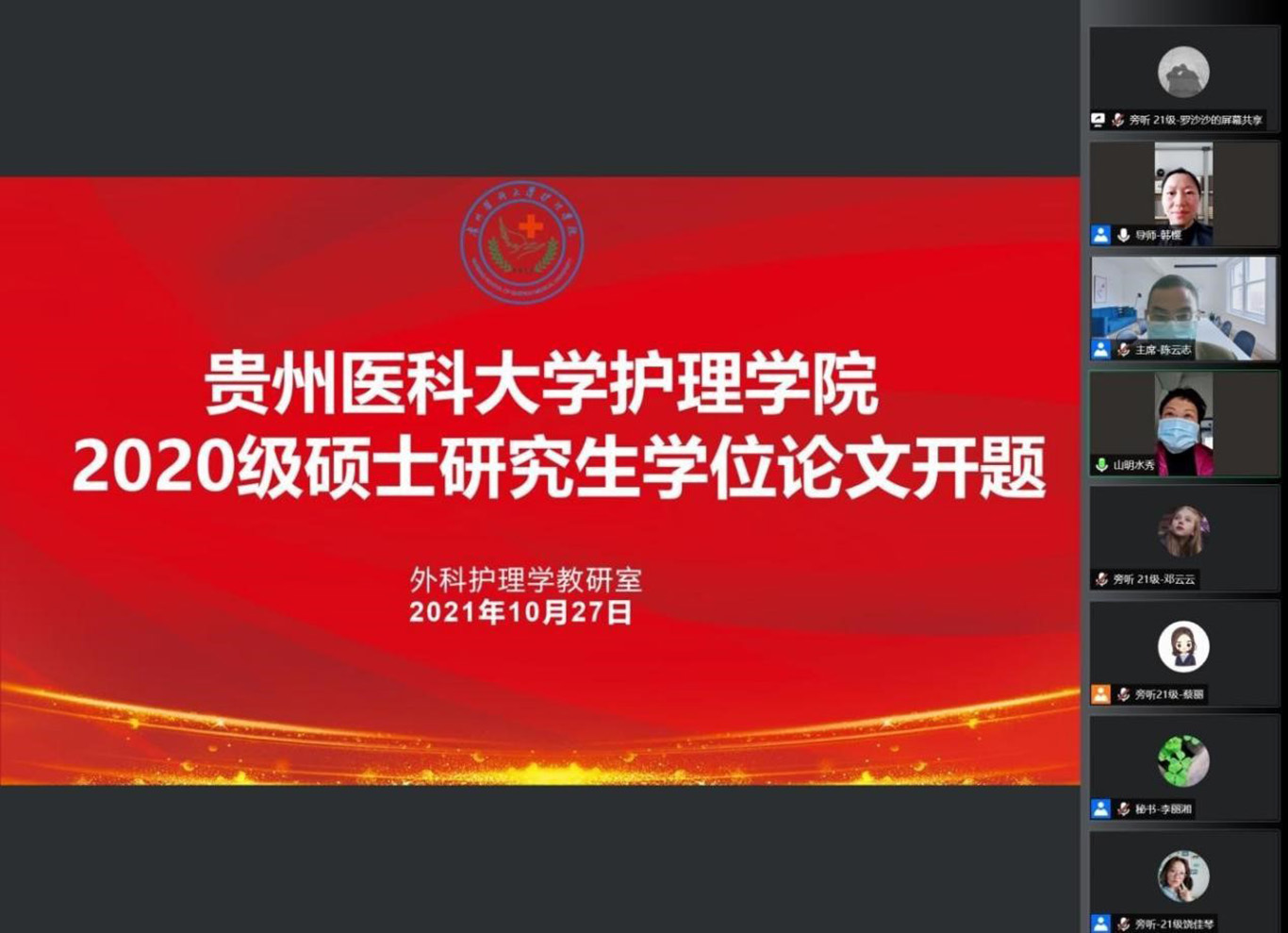 10月26日、27日、29日beats3652020级硕士研究生开题通过腾讯会议在线进行。此次开题分别邀请中南大学湘雅beats365郭佳教授、刘民辉副教授及贵州中医药大学陈云志教授任开题委员会主席;北京大学beats365王志稳教授、 中南大学湘雅三医院健康管理中心秦春香教授、中南大学湘雅beats365杨敏教授、孙枚副教授和王瑶副教授及《护士进修杂志》主编张秀主任、中山大学中山眼科中心肖惠明主任护师、华北理工大学护理与康复公司陈长香教授、广州市护理学会会长黄雪仪主任护师、贵州中医药大学beats365石国凤教授、beats365官网亚洲网页版公共卫生公司流行病学与卫生统计学王子云副教授和汪俊华副教授等担任开题专家委员。beats365导师、副导师、专业教师、研究生等共计参会150人次,研究生院督导专家全程参与。