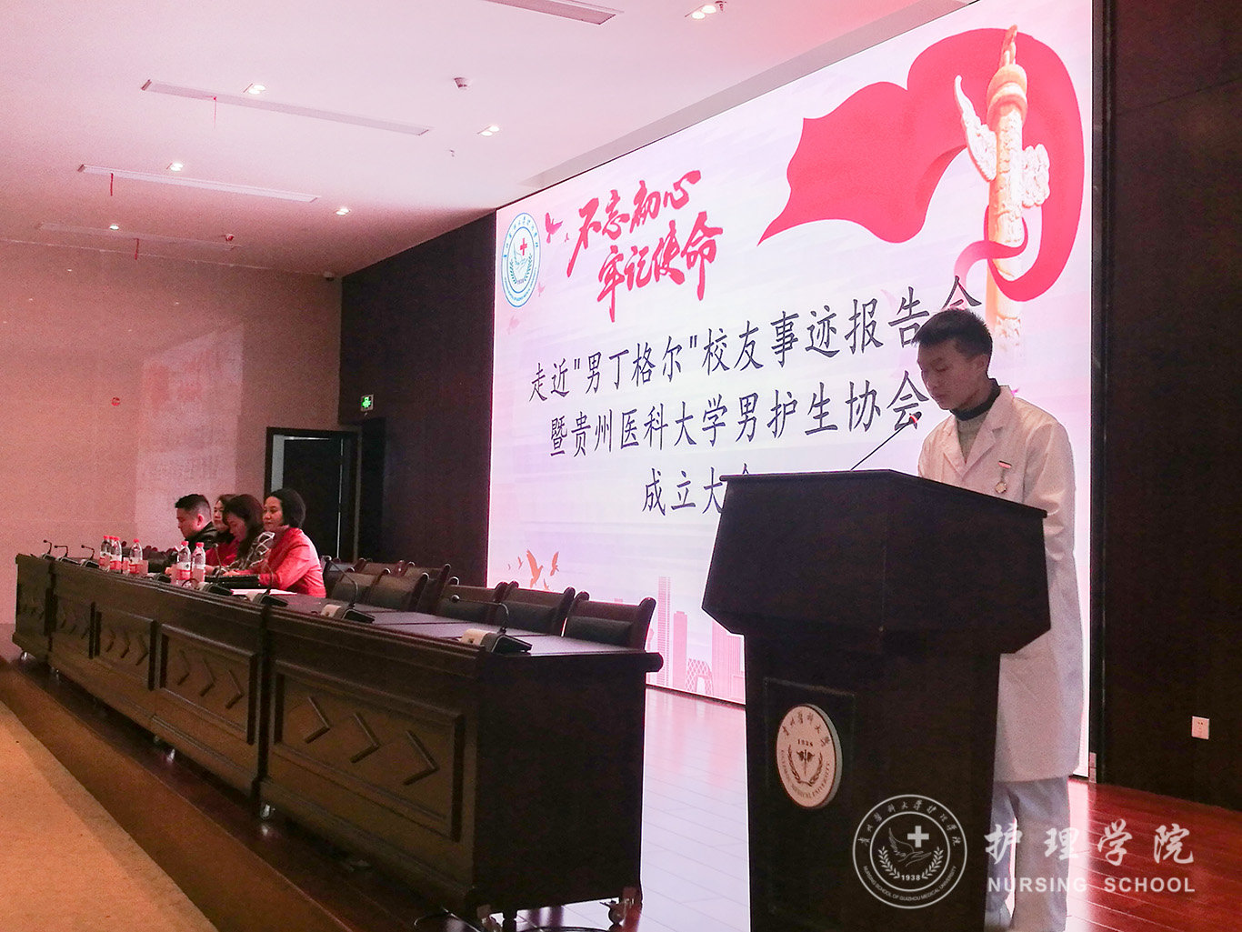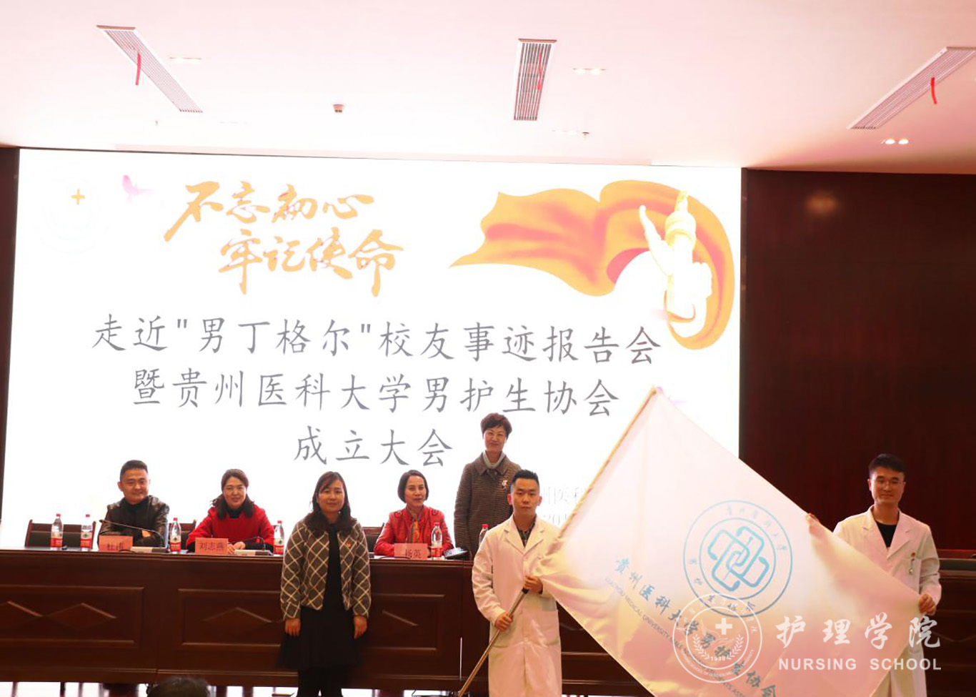 为进一步提升男护生的专业认知和学习兴趣,为男护生提供一个更广阔的学习交流和提升的平台,更好地帮助同学们做好职业生涯规划、坚定专业思想,并以此平台展示贵医男护生形象,让社会更多地了解男护生、了解护理,真正实现“无性别差异的护理”。beats365于2019年12月17日下午在南校区道德讲堂召开“不忘初心、牢记使命”走进“男”丁格尔员工事迹报告会暨beats365官网亚洲网页版男护生协会成立大会。校团委副书记(正处级)桂晓玲、公司党委书记杨英、党委副书记王秀红、副经理刘志燕、员工贵州省人民医院急诊留观输液中心护士长杜伟、beats365教师、男护生协会成员及各班员工代表参加大会,大会由王秀红主持。