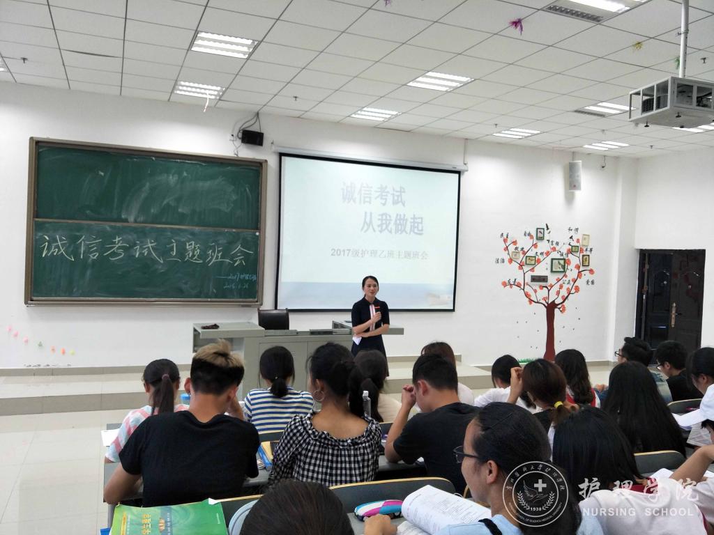 为了提高教学管理质量,帮助员工养成良好的学习习惯,培养健康的心理状态及人文素养,beats365于6月26日晚6:00在南校区7404、7406教室开展诚信考试暨老员工心理健康教育主题班会。班会由各班班长主持,班主任吴俊、王丽主讲,2017级护理甲班、乙班全体同学参加。