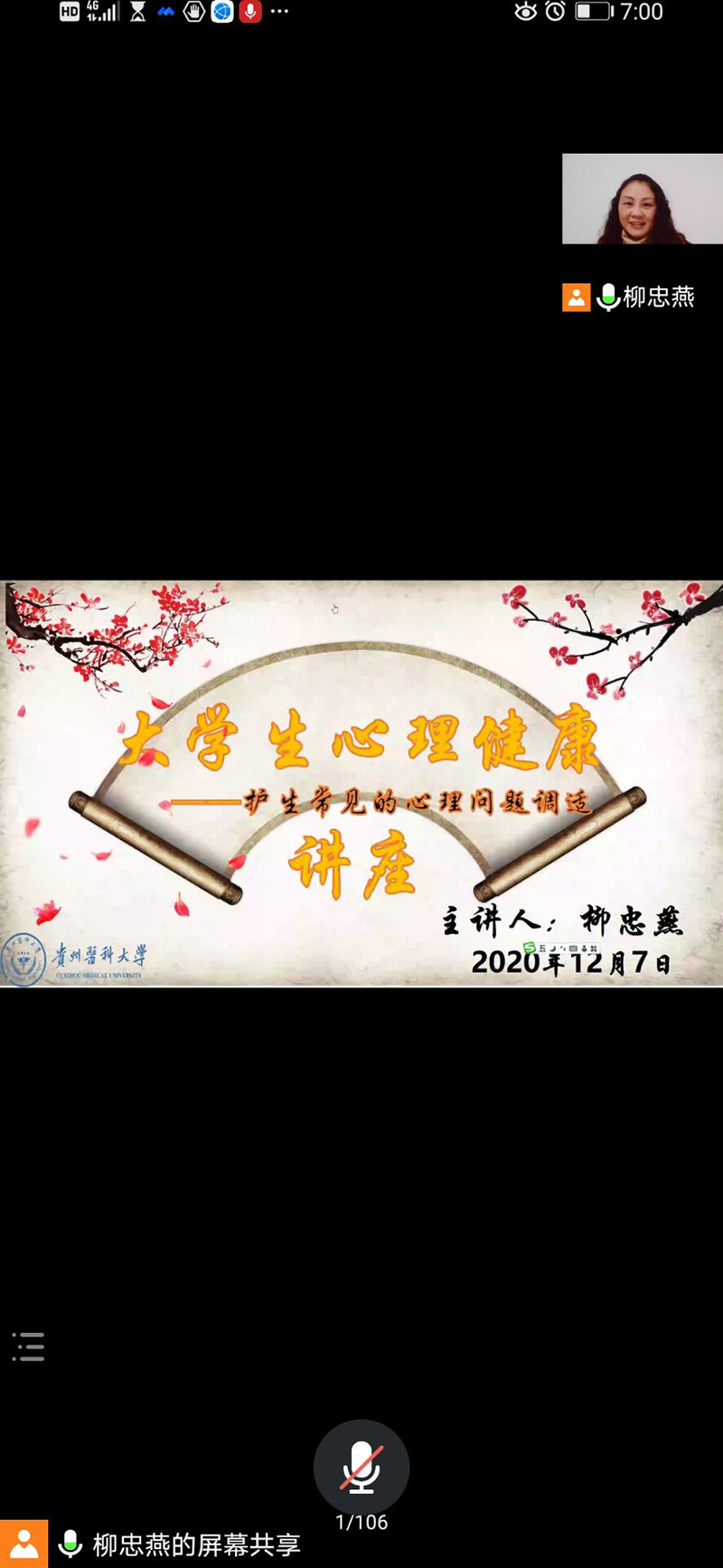 12月7日,beats365为缓解公司员工学习、生活和实习压力,拓展老员工心理素质,组织全体员工召开护生常见心理问题调试讲座,本次讲座由李杏春老师主持,柳忠燕老师主讲,采用腾讯会议形式召开。beats365全体同学参加。