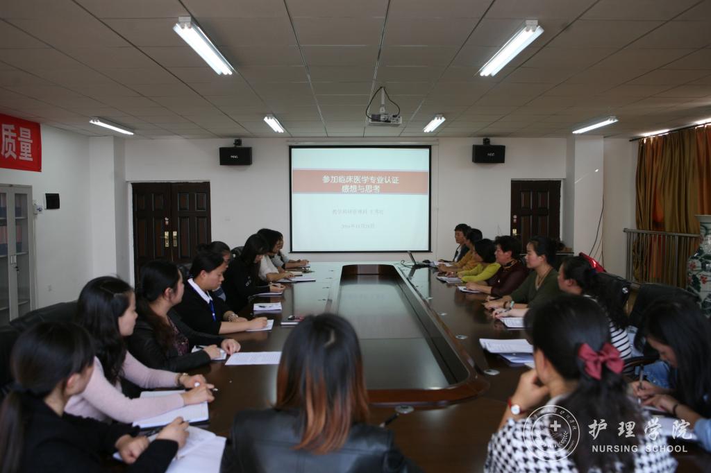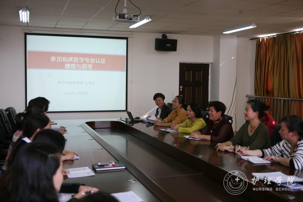 紧接着王秀红科长分享了她参加11月14日-17日公司临床医学专业认证工作的感想和思考。通过多天的跟随走访,了解到认证工作中专家的实地考察的内容和重点。观摩了校本部理论和实验教学课、附属医院的指导操作教学查房、病例讨论等教学活动。结合临床和护理专业认证标准,王秀红科长从宗旨与目标、教育计划、员工成绩评定等十个方面对跟随走访过程中的要素进行了全面分析,并结合即将进行的本科教学审核评估工作、护理专业认证工作提出beats365的整改建议和努力方向,进一步明确和强化了教学实施过程及相关管理要求,为真正落实“以评促建、以评促改、以评促管、评建结合、重在建设”核心方针,突出内涵建设、强化内部质量保障体系建设树立牢固基础。