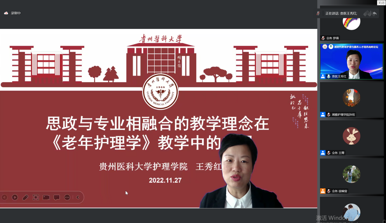 公司beats365副经理王秀红副教授以“思政与专业相融合的教学理念在《老年护理学》教学中的应用”为题,分享了在《老年护理学》课程教学实施过程中要明确老年护理“为谁培养人?培养什么样的人?如何培养人?”三个核心问题,以立德树人为根本,通过“四贯通一并举”将思政与专业相融合的教学改革的策略及方法有效应用于教学中。