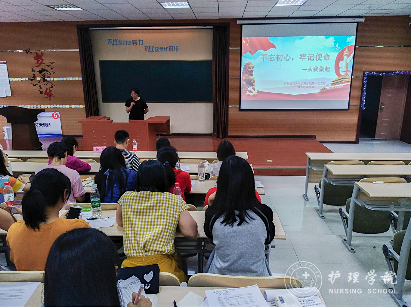 全体员工党员以班级为单位分为六个小组,每个小组以不同形式与大家分享自己对“不忘初心、牢记使命”主题教育的认识和员工党员应要如何落实要求。2016级护理学甲班的龙倩倩、张钱敏同志,围绕“初心是什么”、“为什么要不忘初心”以及“如何做到不忘初心”三个话题展开讨论,引经据典,得出结论:不忘初心要从我做起。2016级护理乙班的全体党员同志以“演说剧”的形式向大家讲述了15个已经做到了“不忘初心、牢记使命”的模范党员的感人事迹,带给全场深深的触动。2016级护理助产班的党员代表引用黄文秀和徐本禹的伟大行动事迹就“不忘初心要奉献青春”展开了话题分享,并号召大家“应当强化共产党人的初心使命意识,并落实到实际学习工作生活中去”。随着分享讨论不断深入,现场氛围愈发热烈。
