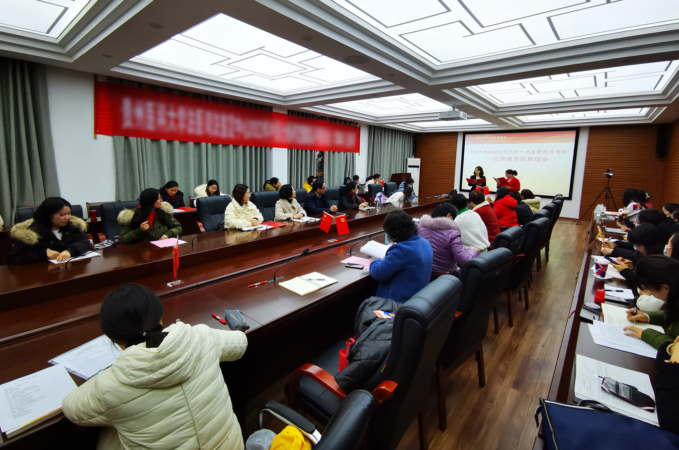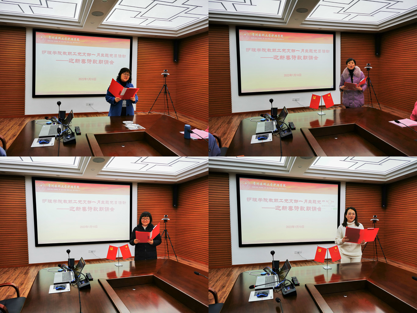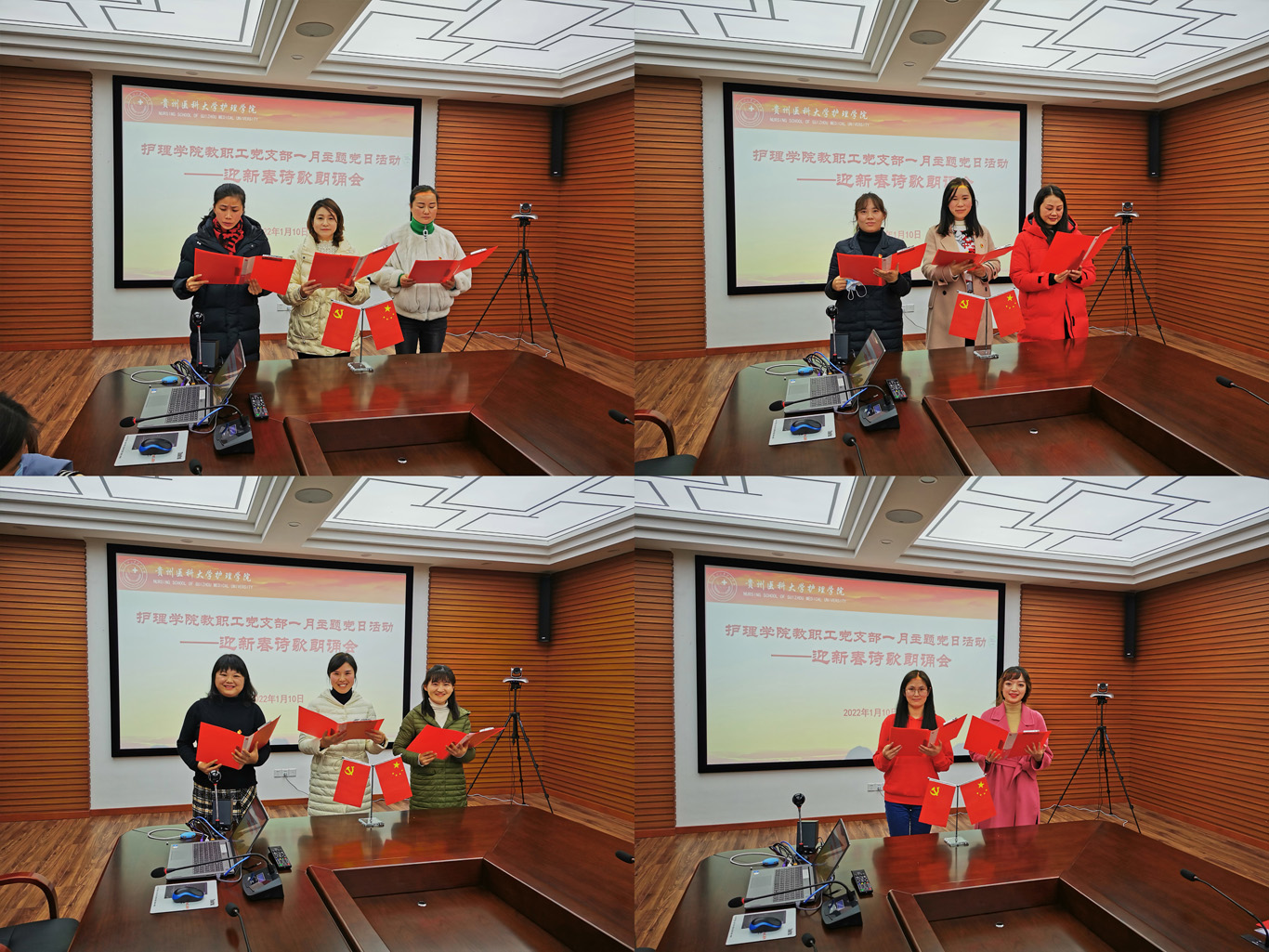 活动以支部党员自由组队的方式进行。各队队员在精心准备下,配合风格各异的自备伴奏,朗诵了激情澎湃的《我爱您中国》、朗朗上口的《卜算子·咏梅》、清婉秀丽又意境悠远的《春江花月夜》、充满希望的《相信未来》等10余首诗歌喜迎新年,精彩纷呈,获得阵阵掌声。活动中,支部还为1月入党的教师党员李红、王丽过了政治生日,李海洋为两位老师送上了政治生日贺卡。两位老师表示:会始终牢记入党初心,谨记党员政治身份,不断增强党性观念,勇于承担党员责任,积极发挥党员先锋模范作用,自觉增强“四个意识”、坚定“四个自信”、做到“两个维护”,为党的事业和教育事业而不懈奋斗。