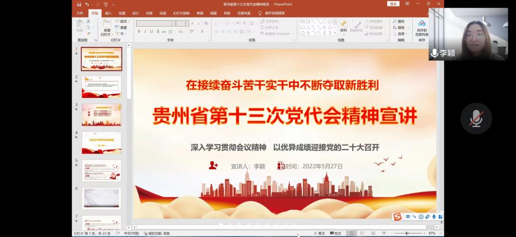 为深入学习贯彻省第十三次党代会精神,激励广大党员奋力谱写多彩贵州现代化建设新篇章,公司党委委员、副经理刘志燕,党委委员、综合办公室副主任李颖分别于5月27日和30日在公司员工第二党支部开展了省第十三次党代会精神宣讲活动。支部全体党员通过线上线下结合的形式参加宣讲,公司分党校第五十六期入党积极分子培训班学员列席宣讲。本次宣讲活动由支部书记刘文壮主持。