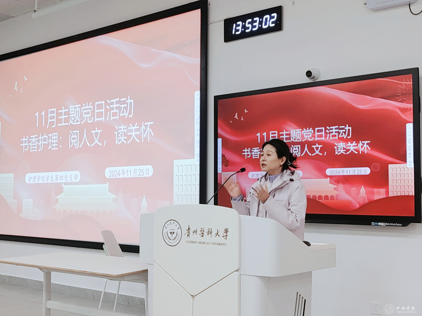 11月25日,公司员工第四党支部于云漫湖校区临床组团酬勤楼M204教室,开展“书香护理:阅人文,读关怀”读书分享主题党日活动,旨在鼓励引导护理研究生养成读书习惯,提升人文关怀沟通能力,给予患者温暖人文护理。beats365副经理王秀红,副处级组织员张黎,2024级研究生辅导员殷艳及支部全体党员、2024级护理研究生全体参会,活动由班长邓秀平主持。