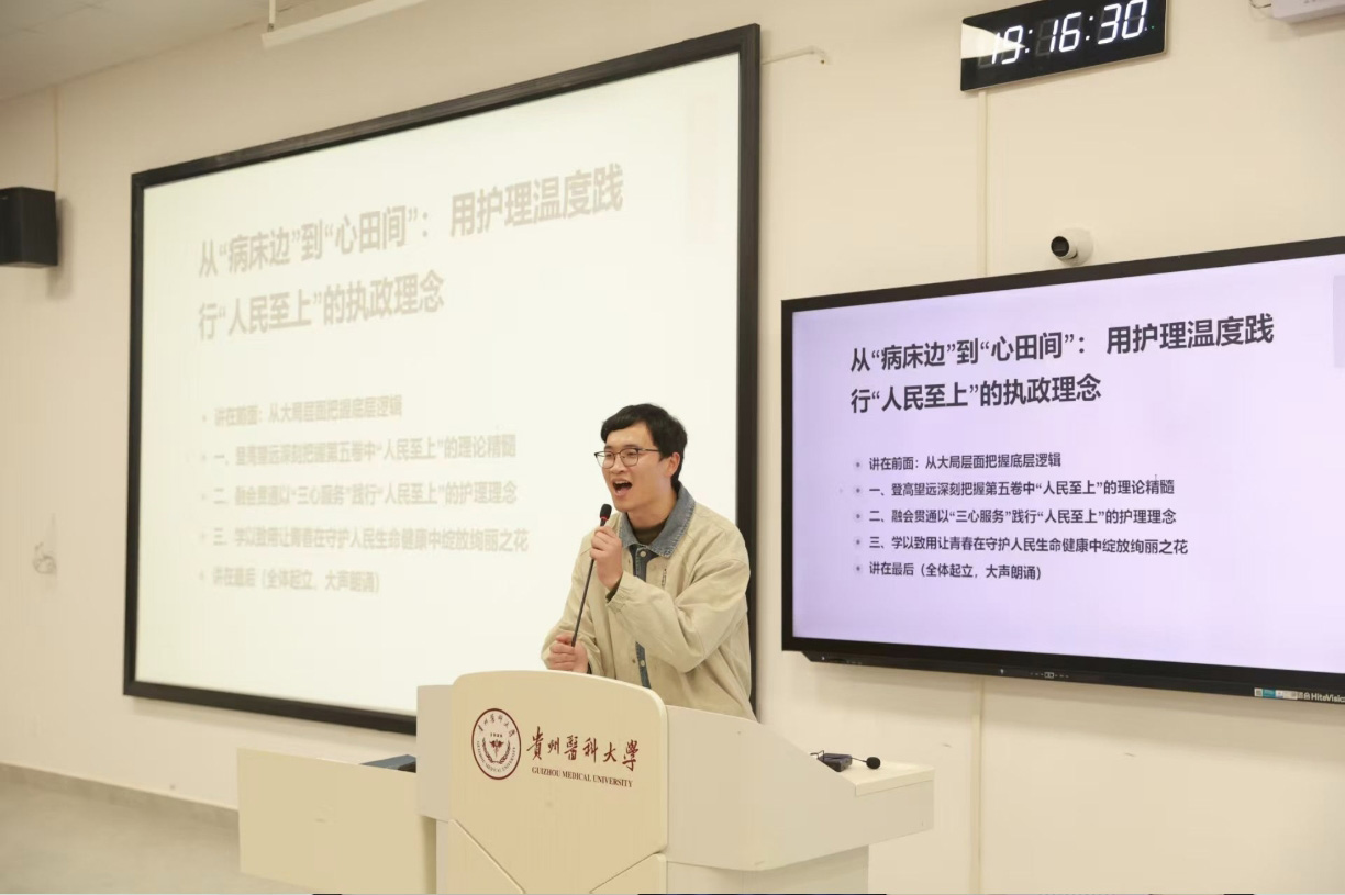 首场宣讲创新采用“师生合作、情景交融”模式,由李勇与护理学2024级1班员工马林飞、蒋福凤、杜思荣共同呈现。围绕“理论唠进心坎里”“实践练出真本事”“技能磨得精湛过硬”“青春建功新时代”四个篇章,通过案例解析、情景模拟等互动形式,将“人民至上”“高质量发展”等理论精髓与护理工作深度结合。内容涵盖“责任制整体护理”专业解读、临床一线“把小事当大事办”实践感悟及“专业技术硬杠杠、人文素养暖洋洋、职业认同亮堂堂”成长目标,让在场师生深刻体会到党的创新理论对护理工作的现实指导意义。