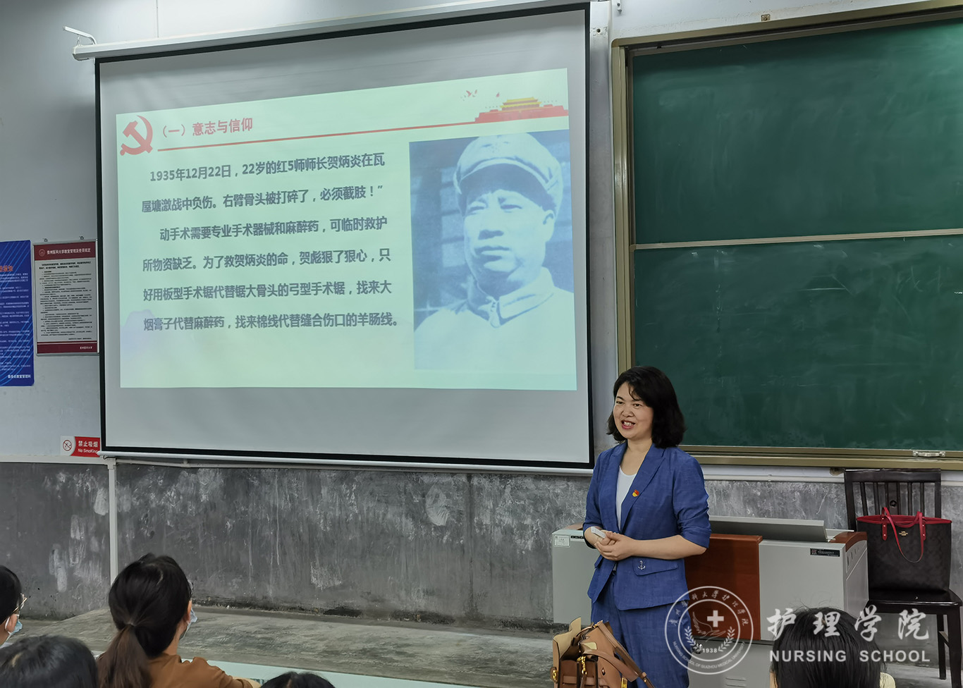 会中,刘志燕以“传承红色基因,推进护理人才高质量发展”为题,从意志与信仰、责任与奉献两个方面为员工党员分享贺炳炎、彭绍辉、程根思、邱少云等革命先烈们感人至深、意义重大的党史故事,每个故事都蕴藏着对党的赞美与热爱,先烈们英勇非凡、舍己为人的伟岸形象深深感染了在场的每一位党员。紧接着,刘志燕为党员们介绍新时代干部党性修养的三个“底色” ,即忠诚、干净、担当,强调忠诚是为政之魂,干净是立身之本,担当是成事之要,为全体党员讲述了一堂生动形象、涤荡思想与灵魂的党课。最后,刘志燕用先烈们浴血奋战的精神,激励全体党员努力学好专业知识和专业技能,在国家召唤人民需要的时候,能够站得出来,冲得上去,担当起救死扶伤、为民服务的历史重任,体现护理人的专业价值和使命担当。