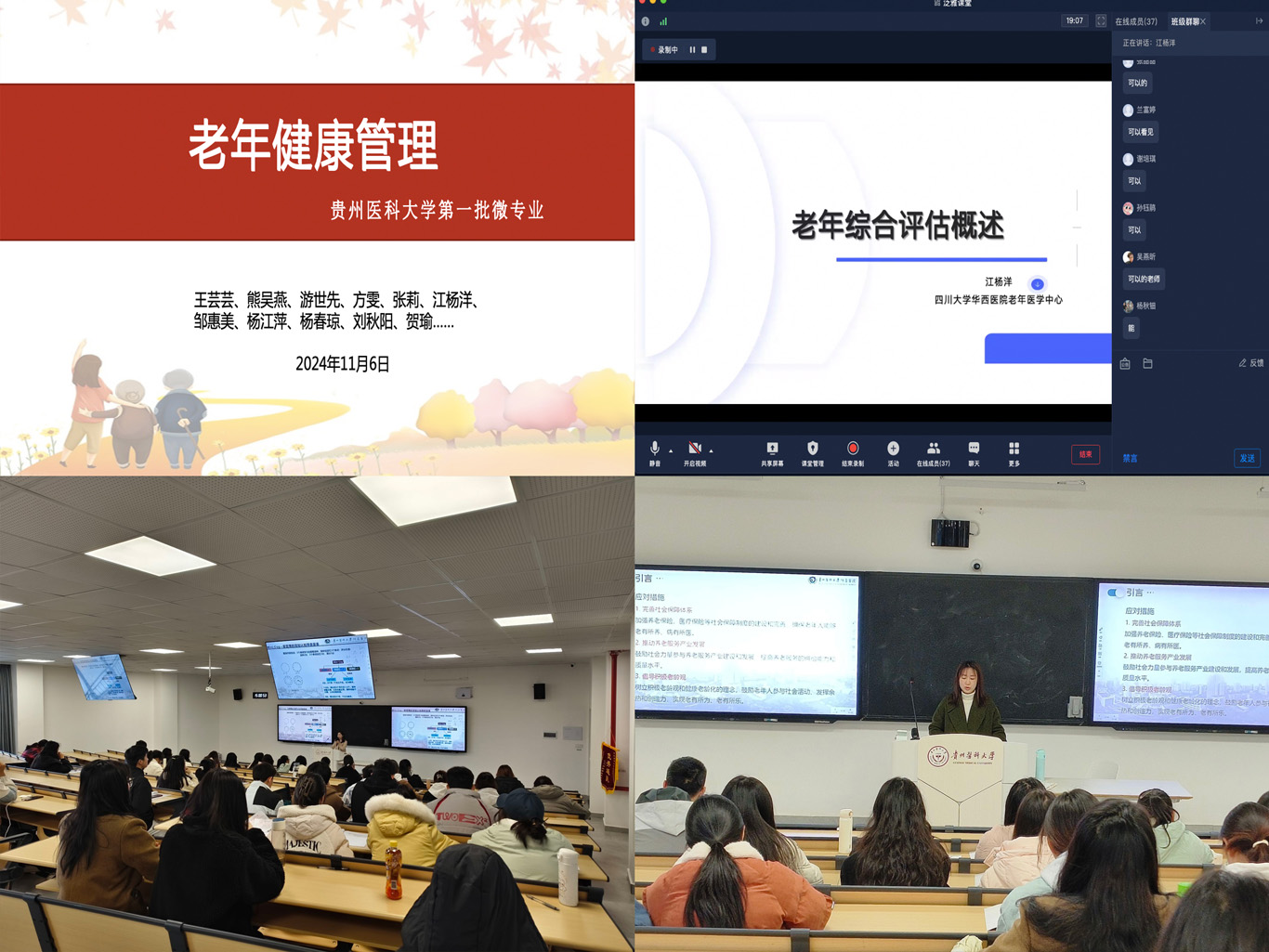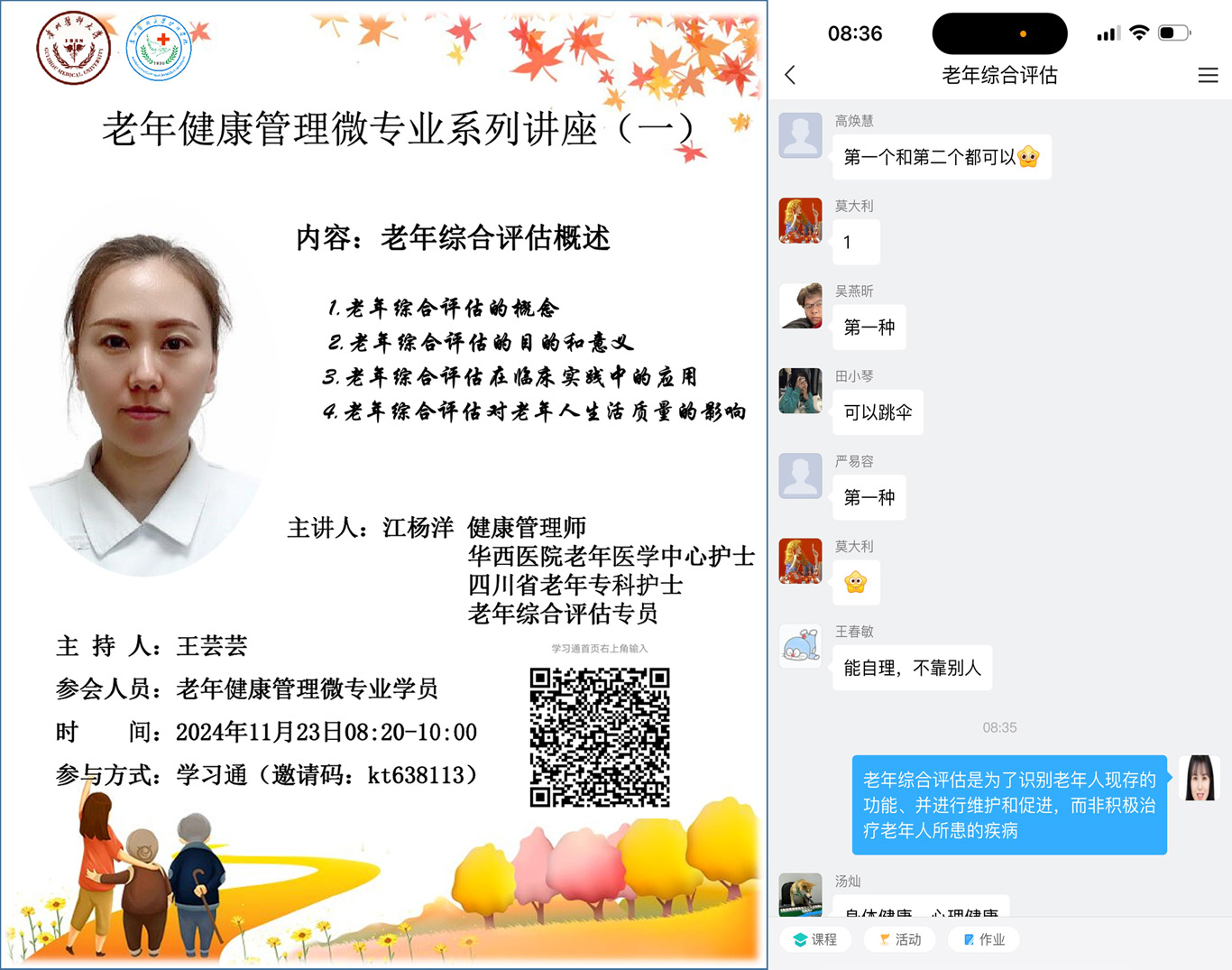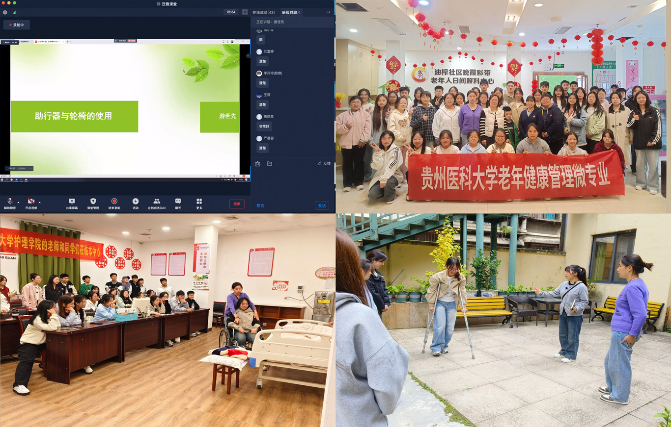 11月6日,老年健康管理微专业正式开课,课程内容涵盖了《老年辅具使用》《养老院的经验与管理》《老年综合评估》等实用科目,授课团队主要由beats365专职教师、南明区晚霞彩带老年人日间照料中心的资深团队成员、附属医院老年医学科医护人员以及四川大学华西医院老年医学中心护士组成。